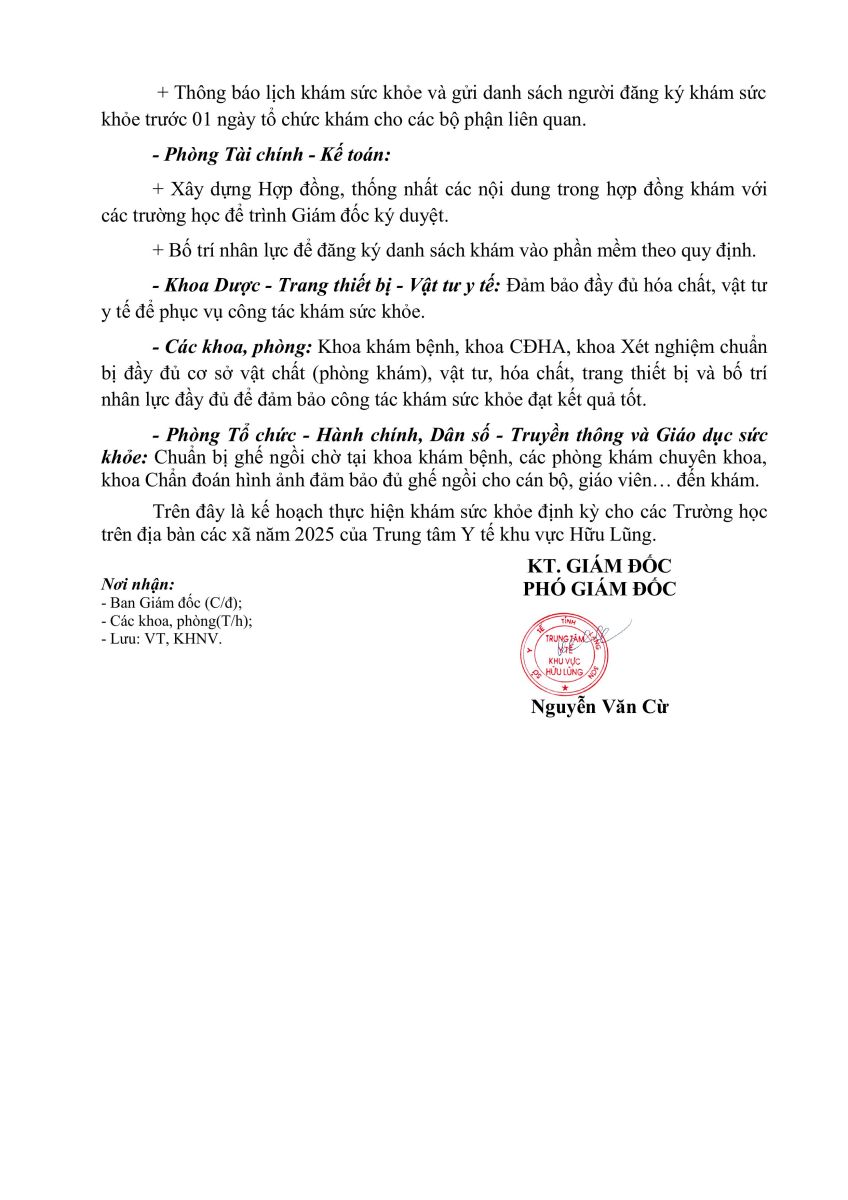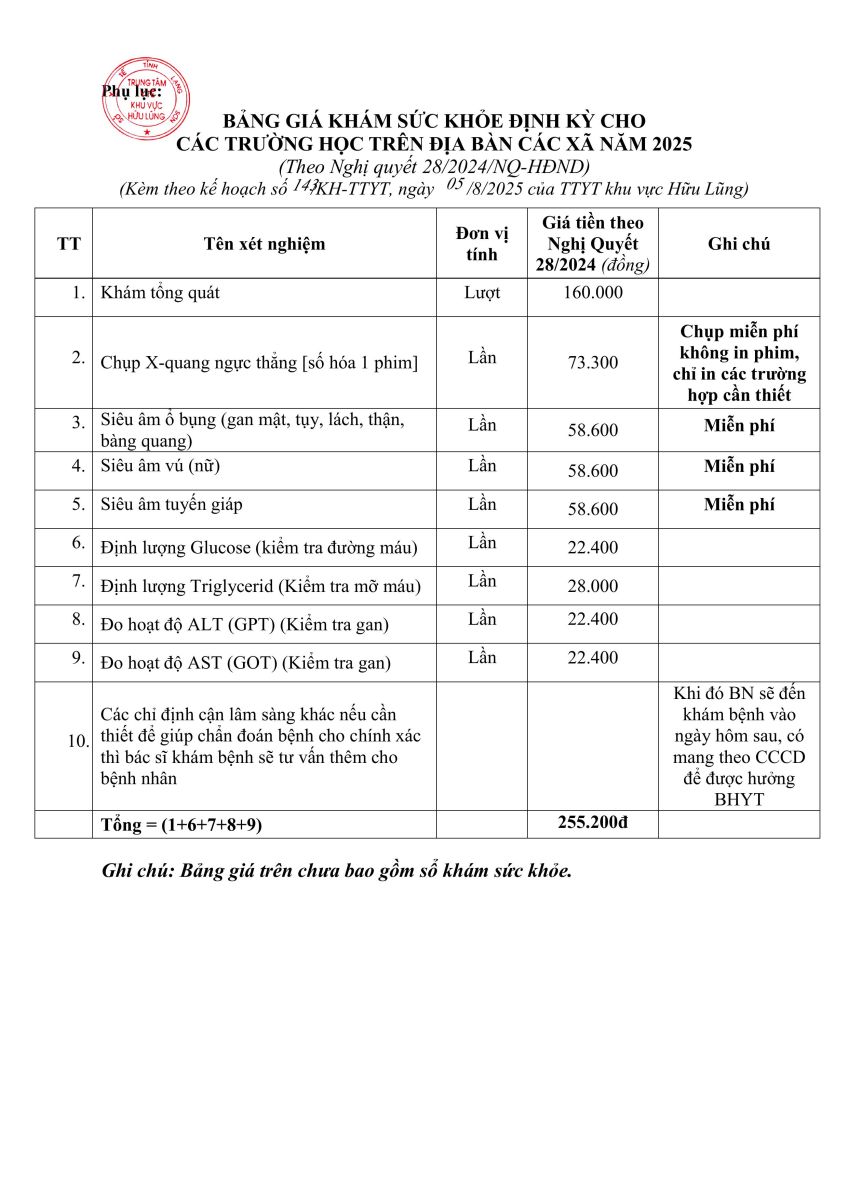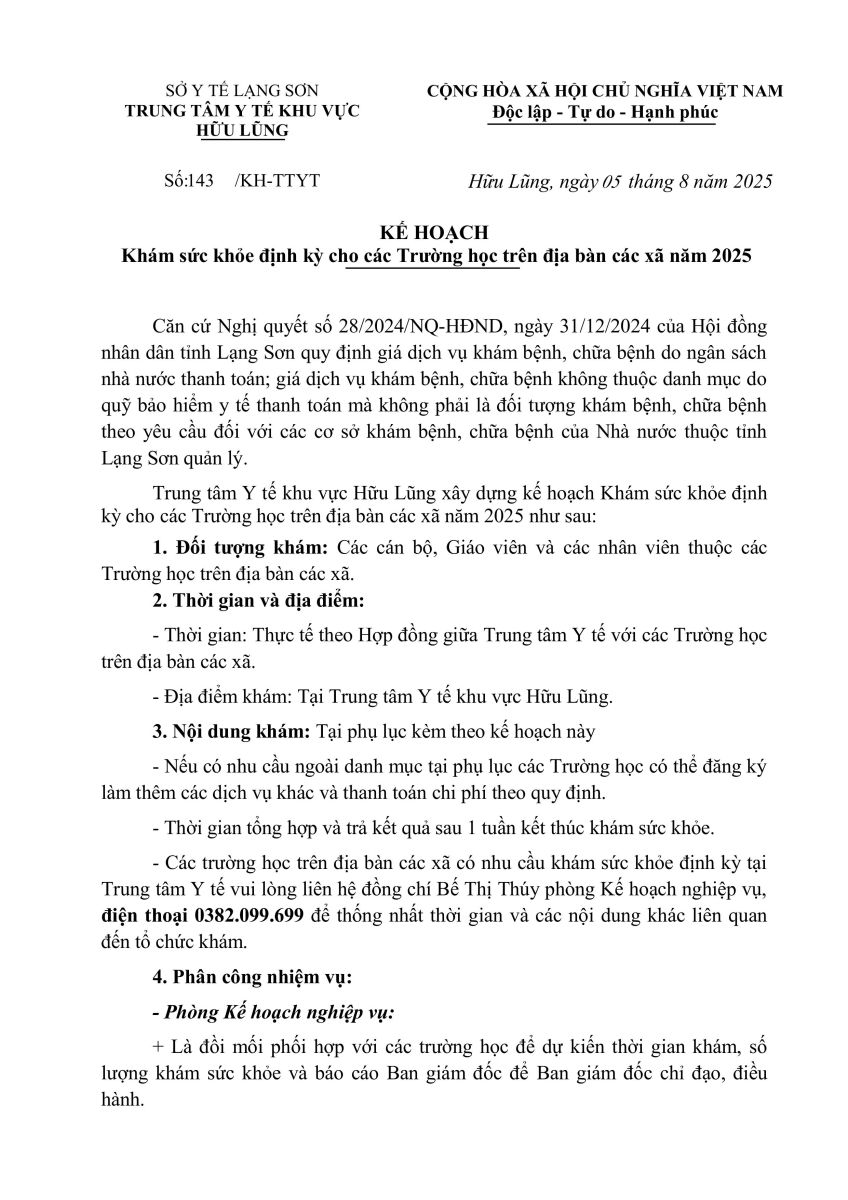 Trung tâm Y tế khu vực Hữu Lũng xây dựng kế hoạch Khám sức khỏe định kỳ cho các Trường học trên địa bàn các xã năm 2025 như sau:1. Đối tượng khám: Các cán bộ, Giáo viên và các nhân viên thuộc các Trường học trên địa bàn các xã.