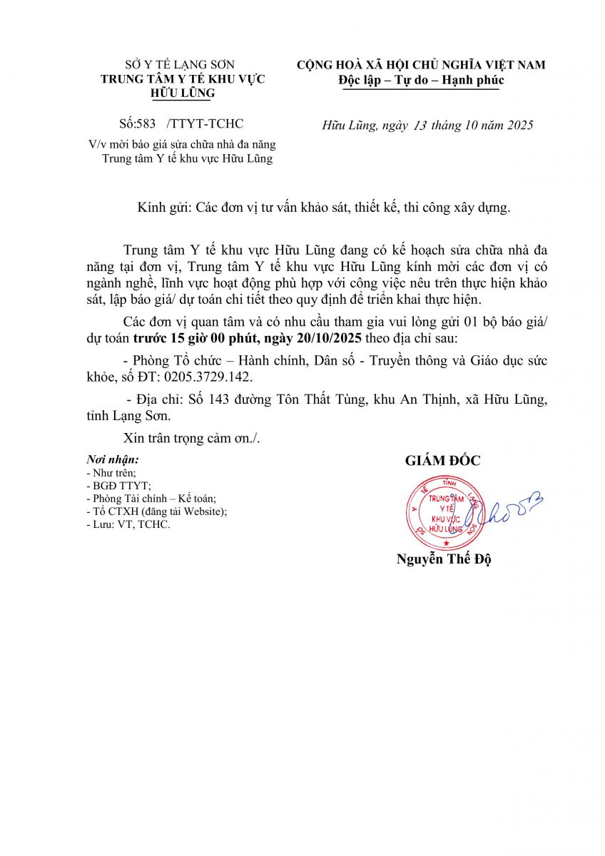 Thông báo mời báo giá thi công sửa chữa khu điều trị Methadone thuộc Trung tâm Y tế khu vực Hữu Lũng