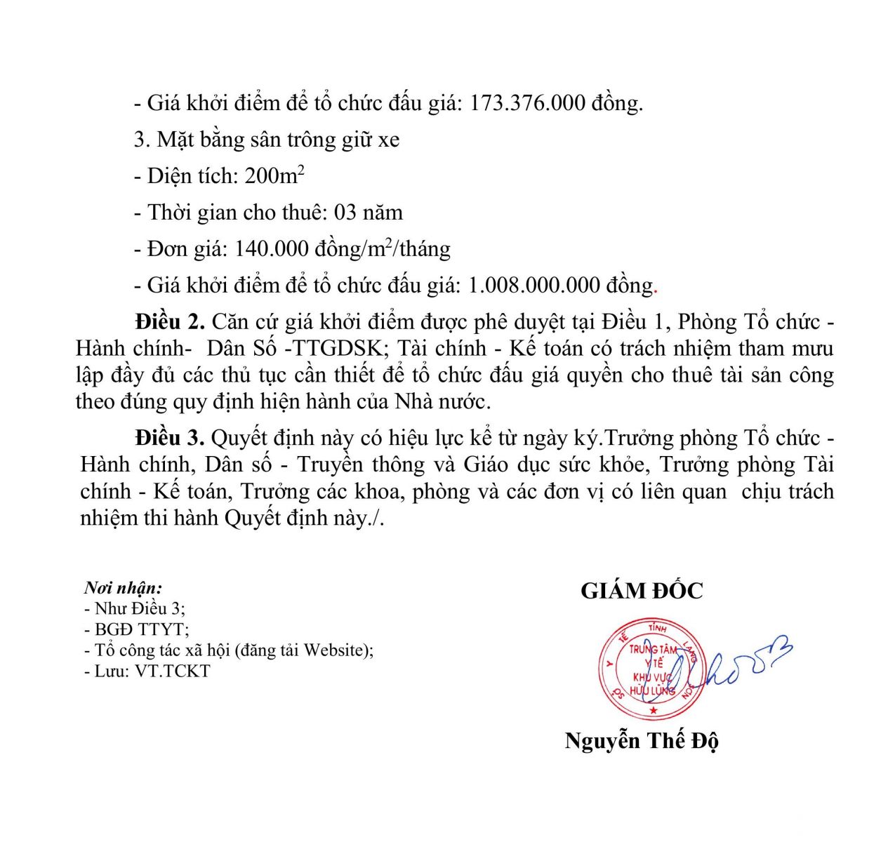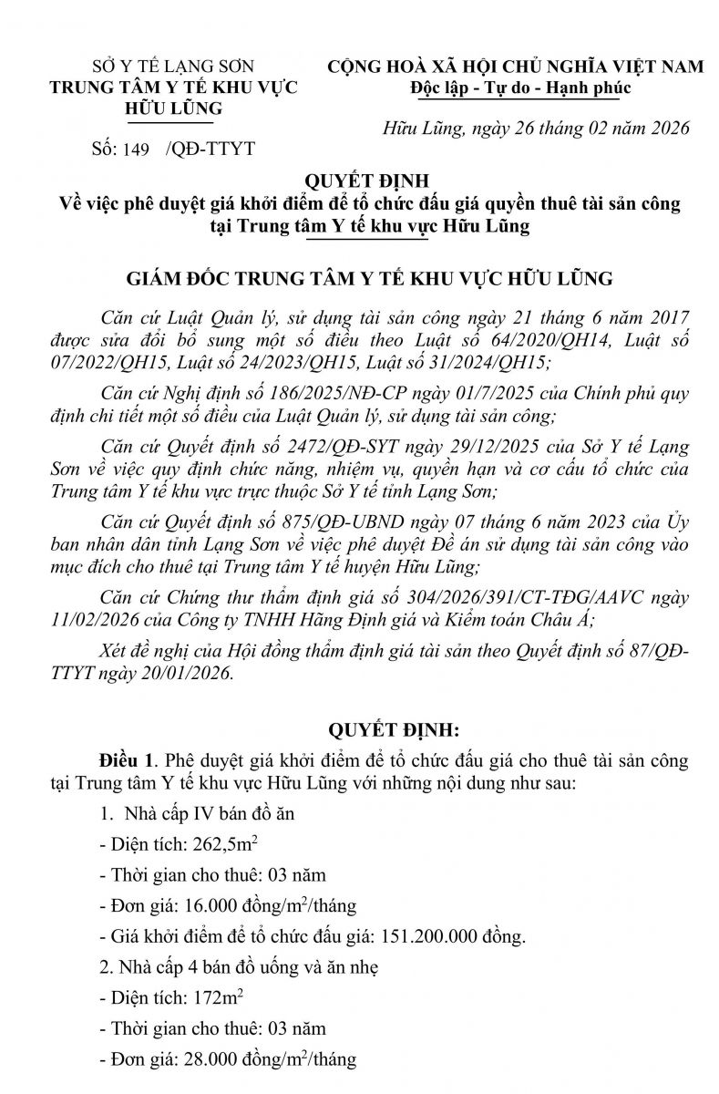 Quyết định về việc phê duyệt giá khởi điểm để tổ chức đấu giá quyền thuê tài sản công tại Trung tâm Y tế khu vực Hữu Lũng