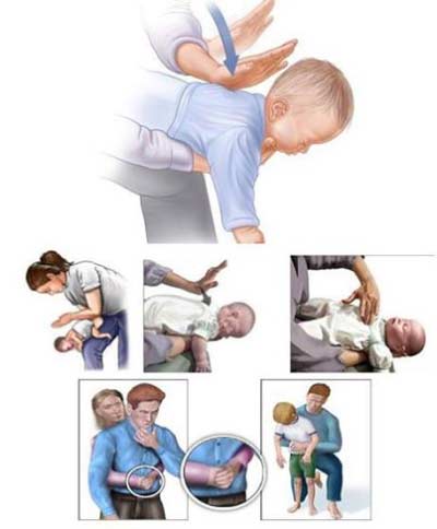 Đối với trẻ dưới 2 tuổi, dùng phương pháp vỗ lưng ấn ngực: Cho trẻ nằm sấp trên cánh tay trái của người sơ cứu, đầu hướng xuống đất. Lưu ý giữ chắc để cổ và đầu trẻ khỏi bị tuột. Dùng gót bàn tay phải vỗ mạnh 5 cái vào vùng lưng giữa 2 xương bả vai của trẻ. Quan sát em bé xem có hồng hào chưa, có thở, khóc được chưa. Kiểm tra miệng trẻ xem có dị vật nào không và lấy ra. Nếu dị vật vẫn chưa ra ngoài hoặc trẻ vẫn chưa thở thì làm tiếp biện pháp ấn ngực. Lấy 2 ngón tay ấn vào vùng thượng vị (vùng trên rốn và dưới xương ức). Ấn mạnh 5 cái theo chiều hướng lên trên. Kiểm tra xem bé đã thở, khóc lại chưa, nếu chưa tiếp tục lặp lại động tác này cho đến khi xe cấp cứu tới.